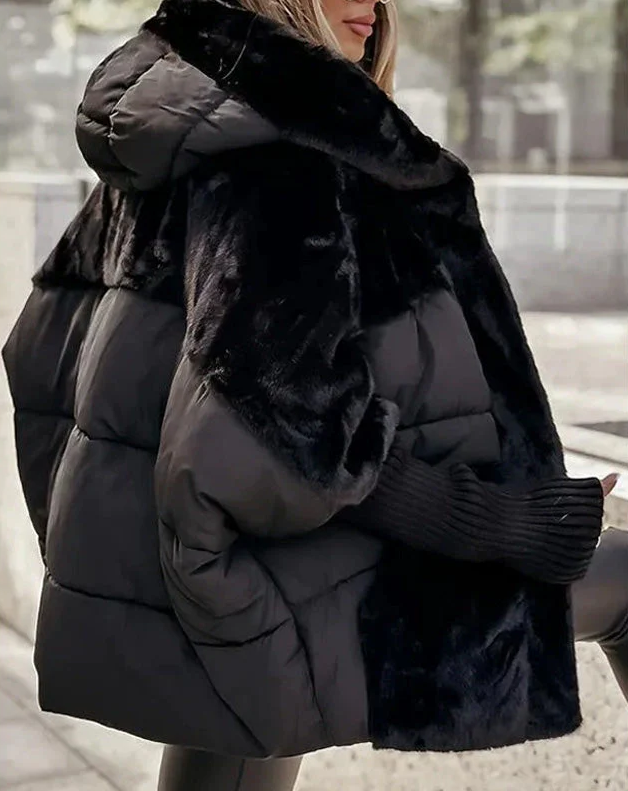 W zestawie: 1 x Damska, oversize'owa, patchworkowa kurtka puchowa z kapturem