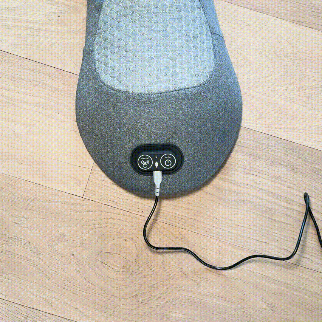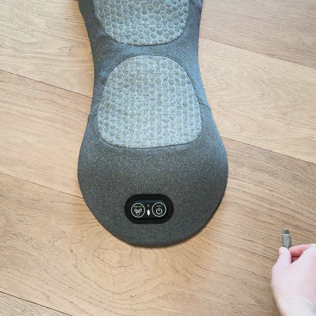 Podłącz kabel USB do urządzenia. Zaświeci się kontrolka przycisku, potwierdzając gotowość urządzenia. Połóż masażer na płaskiej powierzchni, takiej jak podłoga lub łóżko.