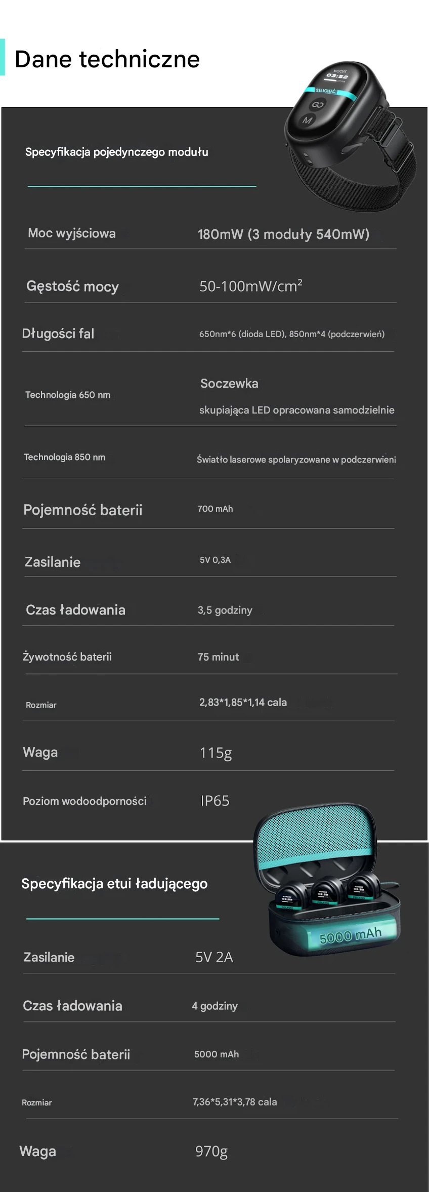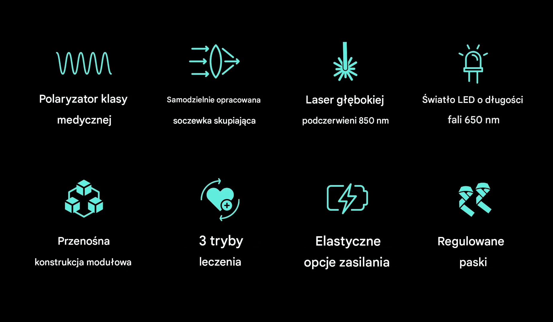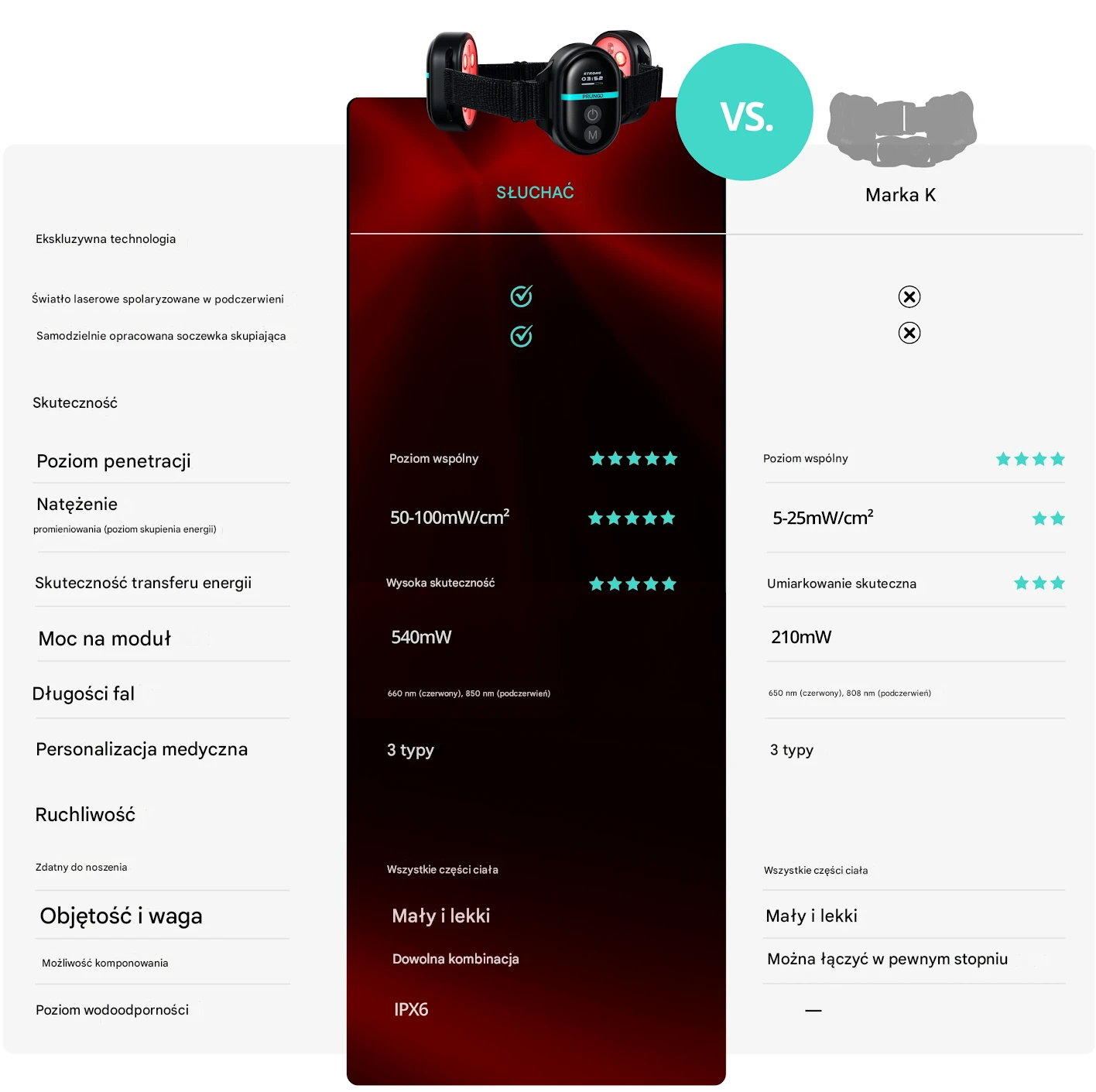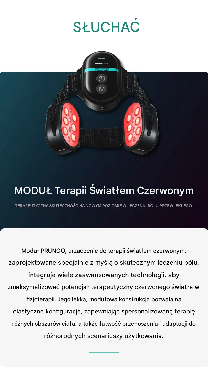 Każdy moduł PRUNGO wyposażony jest w profesjonalną terapię światłem klasy medycznej, obejmującą 6 diod LED o długości fali 650 nm emitujących czerwone światło oraz 4 spolaryzowane światła laserowe o długości fali 850 nm emitujące podczerwień. Zapewniają one dużą moc wyjściową w kompaktowej obudowie, co pozwala na skuteczne, ukierunkowane leczenie.